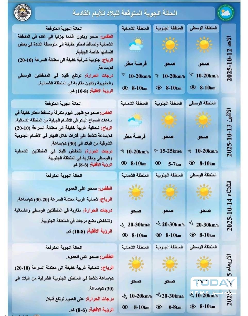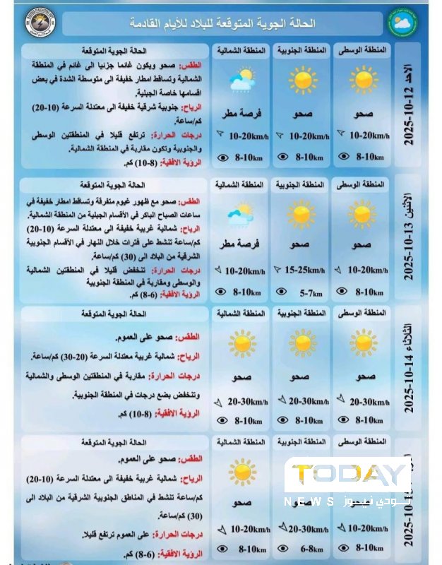 توقعت هيئة الأنواء الجوية، اليوم السبت ، الحالة الجوية للبلاد للأيام المقبلة، فيما أشارت إلى ارتفاع وانخفاض طفيف بدرجات الحرارة في بعض المناطق.