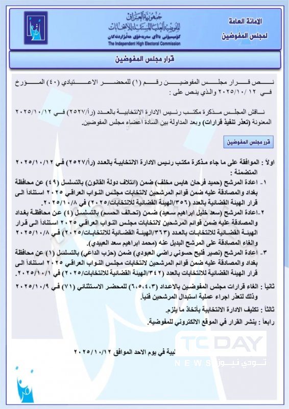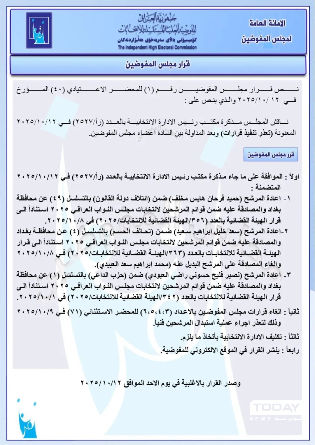 كما قرر المجلس، الموافقة على "إعادة المرشح سعد خليل ابراهيم ضمن تحالف الحسم، عن محافظة بغداد وإلغاء المصادقة على المرشح البديل عنه محمد إبراهيم العبيدي"، فضلاً عن "إعادة المرشح نصير فليح العبودي ضمن حزب الداعي، عن محافظة بغداد".