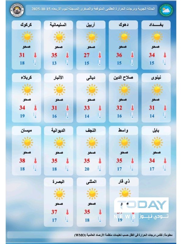 تشير توقعات الطقس في العراق، اليوم الأربعاء ، الى أن أجواء البلاد تكون صحوة بشكل عام مع ظهور بعض السحب في أماكن متفرقة من المنطقة الشمالية، بينما ترتفع درجات الحرارة بشكل طفيف لتكون الأجواء مائلة للبرودة نسبياً في ساعات الصباح والليل، أما في نهاراً فتكون معتدلة.