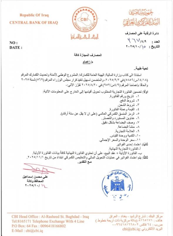ويأتي هذا القرار في إطار جهود البنك المركزي العراقي والجهات الحكومية لتطوير البيئة المالية والإدارية، وتحسين مستوى الرقابة والامتثال للمعايير الدولية في التجارة الخارجية.