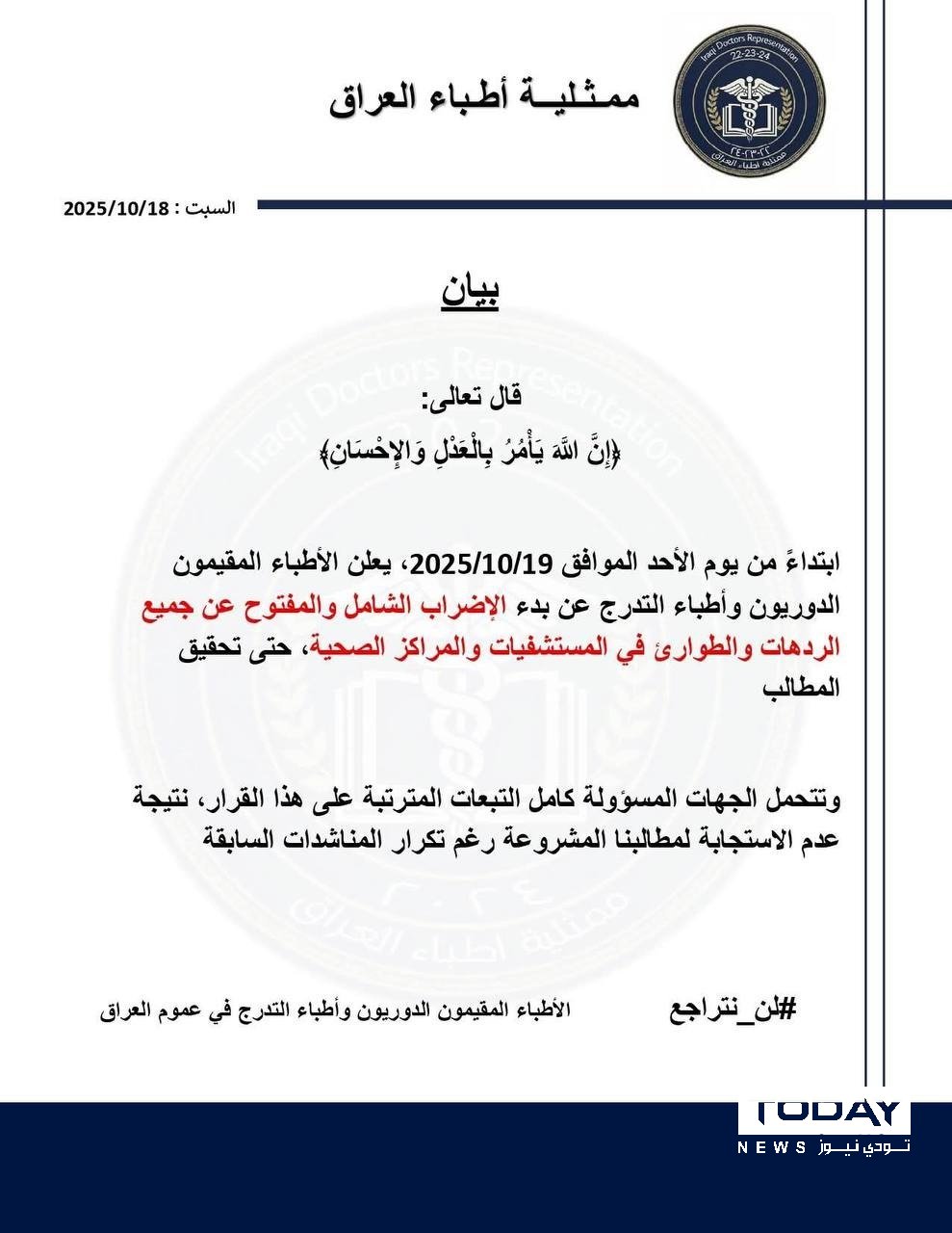 أعلنت ممثلية أطباء العراق، اليوم السبت، عن بدء الأطباء المقيمون الدوريون وأطباء التدرج، الإضراب الشامل والمفتوح عن جميع الردهات والطوارئ في المستشفيات.
