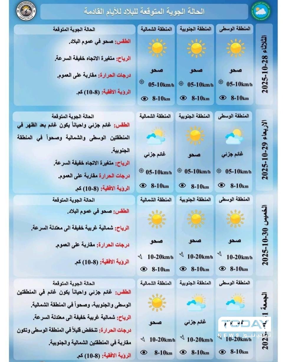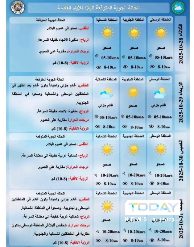 توقعت الهيئة العامة للأنواء الجوية والرصد الزلزالي، اليوم الاثنين، استمرار استقرار الحالة الجوية في عموم البلاد خلال الأيام المقبلة، مع أجواء صافية إلى غائمة جزئياً في بعض المناطق.