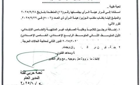 التربية تقرر إضافة درجتين لطلبة الصفوف غير المنتهية لمعالجة الحالات الحرجة